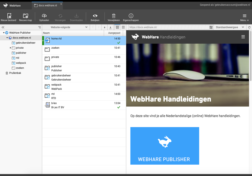 The folder tree show all folders you have access to. Some of these are special folders: in the publisher, a website is also a folder, recognisable from the globe icon. Above the folder three there is a workbar - the << arrows allow you to hide the folder tree, and the button on the right offers access to the bread crumb navigation.