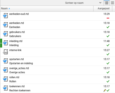 Above the file list a work bar is available for some settings. When the view mode is set to "Website order" the "move" buttons (to top, up, down, to bottom) can be used to set the order of the items in the website. Finally you can switch between single or double row layout for the file list.