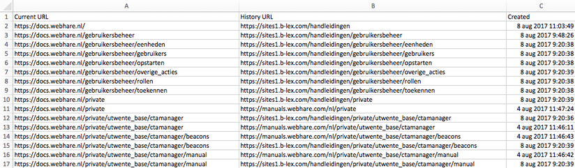 An Excel file is downloaded that contains all historical URLs for this website. This includes manually moved pages, edited menu-names or, in the example below, the setup of a website on WebHare testserver and publication on the production server with the correct URLs.