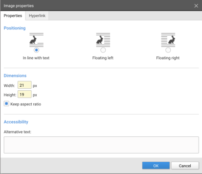 The image properties allow you to set the image positioning and size. For accessibility reasons an alternative text (used for visually impaired browsers for example) can be added. On the second tab a hyperlink can be added for the image.