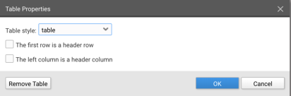 The "Tables" button can be used to create tables: click the button and select the desired height and width.