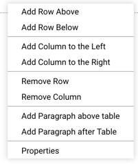 When you have placed your cursor inside of a table you can use the context menu (right mouse button) for available actions: